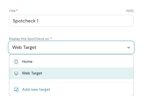 To create a target, click on the Target dropdown, and select "**Add new target**". This will provide you with all instructions on how to embed SpotChecks on both mobile and web applications.