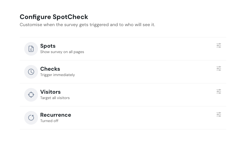 The Configure panel is crucial for setting conditions for your target. It allows you to optimize feedback collection by displaying the survey to users at specific moments and intervals, ensuring that feedback is gathered in the most effective and relevant manner.