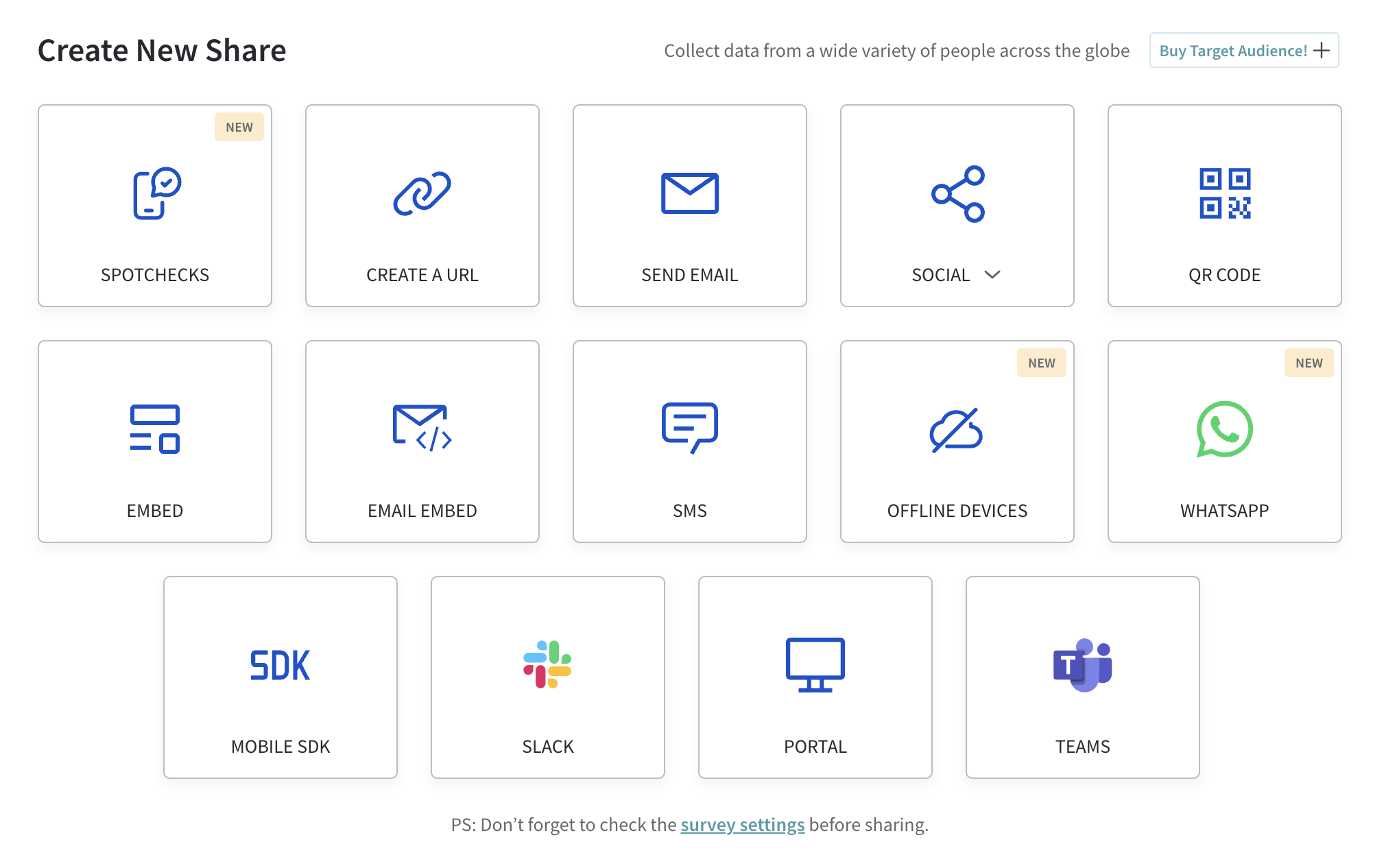 After creating a survey in your SurveySparrow account, navigate to the **SHARE** tab where you will find a channel named "SPOTCHECKS". Selecting "SPOTCHECK" will redirect you to the SpotChecks settings page.